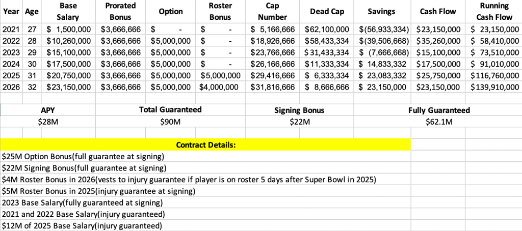 Watt gets his P5 salary from 2021 thru 2023 guaranteed, with 2023 being fully guaranteed at signing. He receives a $22M signing bonus, which accounts for his Year 1 cash flow along with a fully guaranteed $1.5M base salary. The signing bonus is prorated at $3.66M throughout the duration of his contract. Also available in this contract is a $25M option bonus, which can be exercised in 2022. Since the option is fully guaranteed, the Steelers have one of two choices: They can opt to pick up this option, and prorate $5M each year until the termination of the contract, or they can decline the option and add all $25M to the 2022 cap charge, fully guaranteed. The latter is extremely unlikely, meaning the Steelers will exercise this option, giving Watt extra job security for the duration of the deal. In this projection, Watt has a fully guaranteed $5M roster bonus in 2025, which does affect his dead cap and cap charge. In 2026, he has another roster bonus, this time $4M, which vests into an injury guarantee if Watt is on the team 5 days after the Super Bowl in 2025.